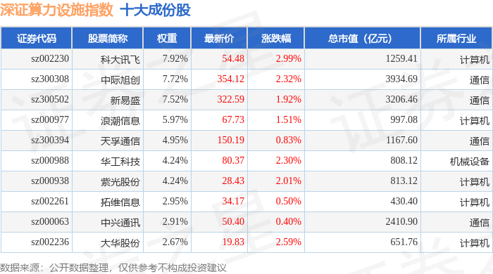 证券之星消息,10月15日,深证算力设施(970051)指数报收于10994.2点,涨1.53%,成交892.49亿元,换手率3.27%。当日该指数成份股中,上涨的有45家,朗科科技以5.97%的涨幅领涨,下跌的有5家,全志科技以0.8%的跌幅领跌。