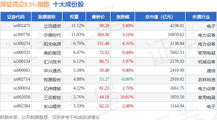 深证民企ESG(970056)指数十大成份股详情如下: