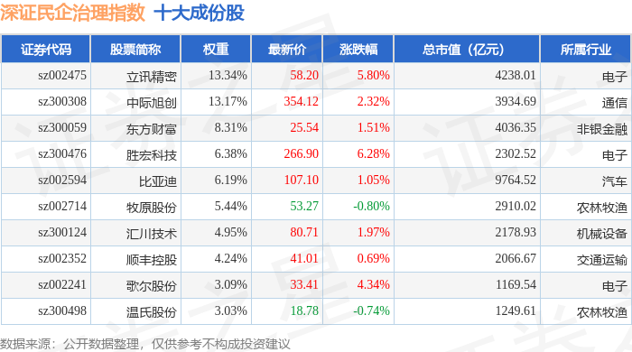 深证民企治理(970058)指数十大成份股详情如下: