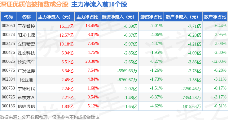 资金流向方面,深证优质信披(970065)指数成份股当日主力资金净流入合计48.79亿元,游资资金净流出合计49.74亿元,散户资金净流入合计9497.51万元。成份股资金流向详情见下表:
