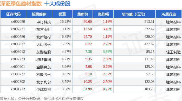 深证绿色建材(970077)指数十大成份股详情如下: