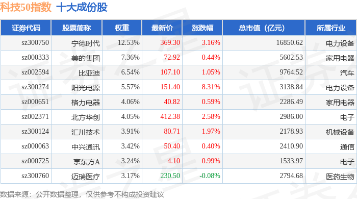 证券之星消息,10月15日,科技50(970080)指数报收于3198.78点,涨2.18%,成交1526.57亿元,换手率2.21%。当日该指数成份股中,上涨的有47家,三花智控以10.01%的涨幅领涨,下跌的有3家,晶盛机电以2.97%的跌幅领跌。