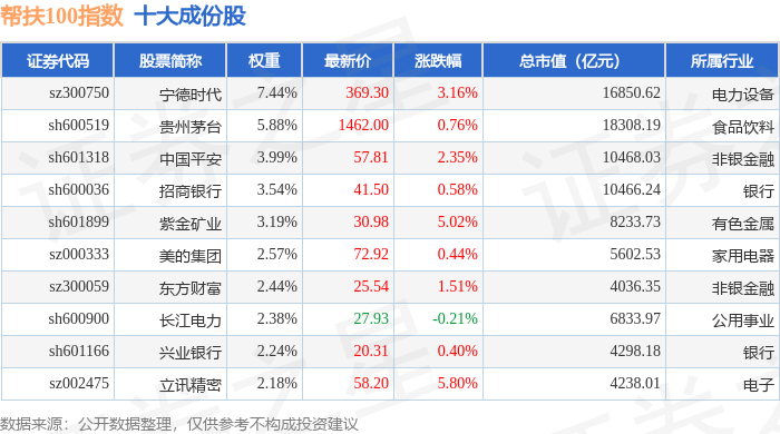 证券之星消息,10月15日,帮扶100(980065)指数报收于2155.97点,涨1.58%,成交2728.85亿元,换手率0.5%。当日该指数成份股中,上涨的有73家,三花智控以10.01%的涨幅领涨,下跌的有25家,荣盛石化以0.93%的跌幅领跌。