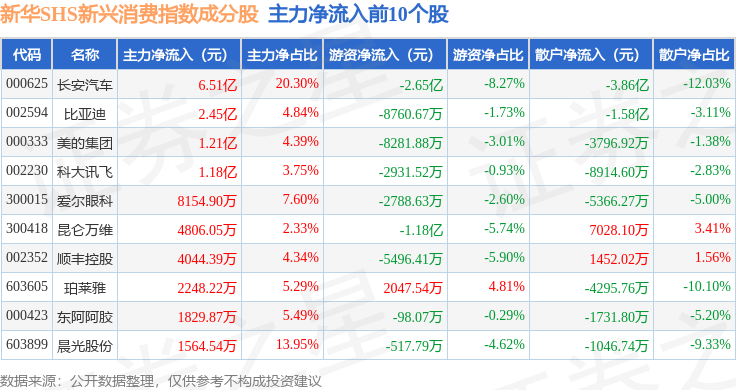 资金流向方面,新华SHS新兴消费(989006)指数成份股当日主力资金净流入合计12.2亿元,游资资金净流出合计6.58亿元,散户资金净流出合计5.61亿元。成份股资金流向详情见下表: