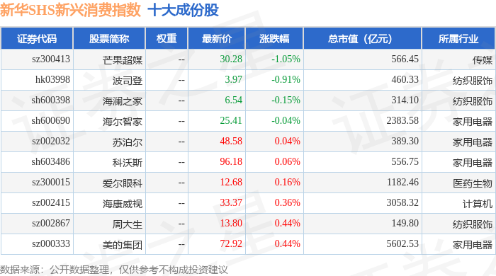 新华SHS新兴消费(989006)指数十大成份股详情如下: