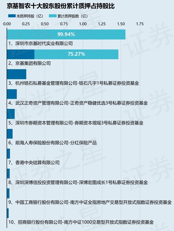截止本公告日,股东深圳市京基时代实业有限公司已累计质押股份1.56亿股,占其持股总数的99.94%,股东京基集团有限公司已累计质押股份1.11亿股,占其持股总数的75.27%。本次质押后京基智农十大股东的累计质押股份占持股比例(占持股比例的计算以公司最新一期财务报表公布的十大股东的持股总数为基准)见下图: