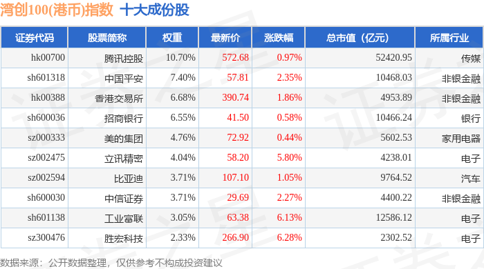 湾创100(港币)(980002)指数十大成份股详情如下: