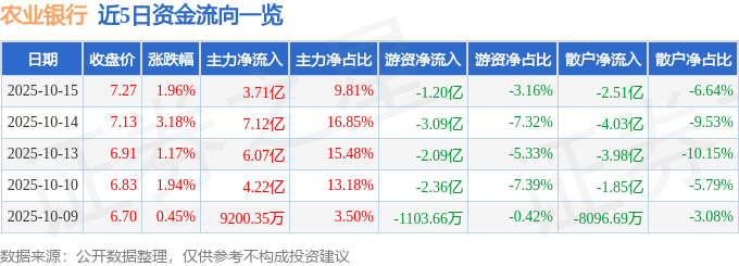 证券之星消息,截至2025年10月15日收盘,农业银行(601288)报收于7.27元,上涨1.96%,换手率0.16%,成交量524.17万手,成交额37.8亿元。