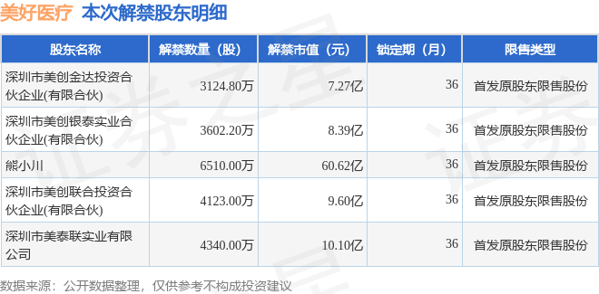 证券之星消息,根据市场公开信息整理,美好医疗(301363)于10月16日将有2.17亿股限售股份解禁,为公司首发原股东限售股份,占公司总股本38.15%。(本次数据根据历史公告整理得出,实际情况以上市公司最新公告为准)本次解禁后,公司还有1.96亿股限售股份,占总股本34.4%。具体如下图所示: