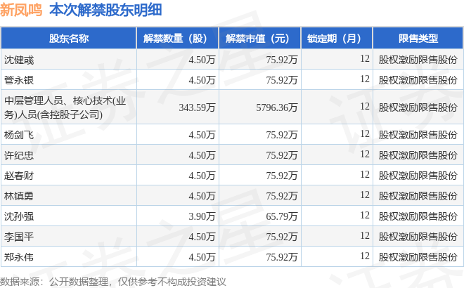 证券之星消息,根据市场公开信息整理,新凤鸣(603225)于10月16日将有383.49万股限售股份解禁,为公司股权激励限售股份,占公司总股本0.25%。(本次数据根据历史公告整理得出,实际情况以上市公司最新公告为准)本次解禁后,公司还有894.81万股限售股份,占总股本0.59%。具体如下图所示: