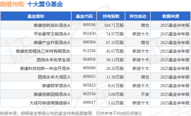 根据2025基金半年报公募基金重仓股数据,重仓该股的公募基金共11家,其中持有数量最多的公募基金为泰康基金的泰康创新成长混合A。泰康创新成长混合A目前规模为7.27亿元,最新净值1.2872(10月15日),较上一交易日上涨2.22%,近一年上涨50.97%。该公募基金现任基金经理为薛小波。薛小波在任的基金产品包括:泰康产业升级混合A,管理时间为2019年5月17日至今,期间收益率为160.0%;泰康优势精选三年持有期混合,管理时间为2021年8月31日至今,期间收益率为11.82%。