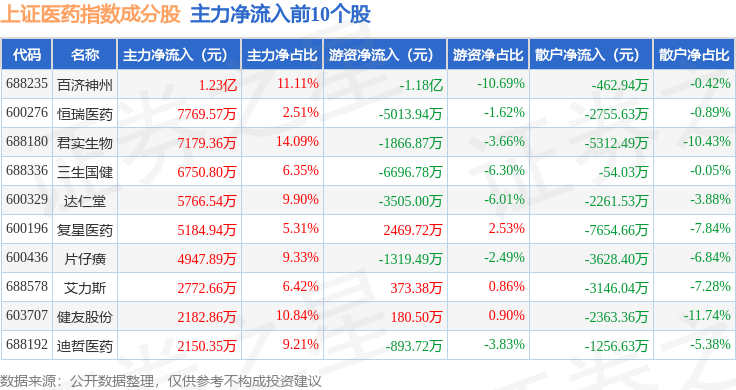 资金流向方面,上证医药(000037)指数成份股当日主力资金净流出合计1.68亿元,游资资金净流出合计9426.49万元,散户资金净流入合计2.63亿元。成份股资金流向详情见下表: