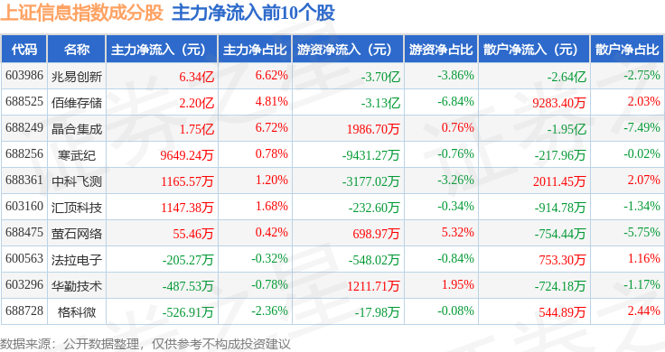 资金流向方面,上证信息(000039)指数成份股当日主力资金净流出合计45.8亿元,游资资金净流入合计18.68亿元,散户资金净流入合计27.12亿元。成份股资金流向详情见下表: