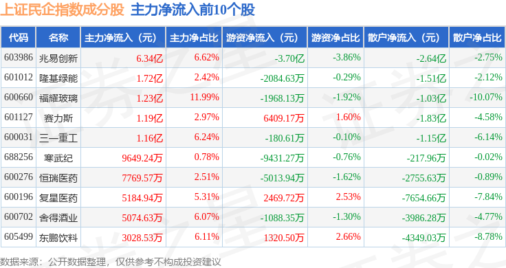 资金流向方面,上证民企(000049)指数成份股当日主力资金净流出合计32.7亿元,游资资金净流入合计10.62亿元,散户资金净流入合计22.08亿元。成份股资金流向详情见下表: