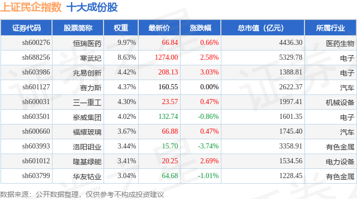 证券之星消息,10月16日,上证民企(000049)指数报收于2059.57点,跌0.11%,成交1009.33亿元,换手率2.03%。当日该指数成份股中,上涨的有18家,兆易创新以3.03%的涨幅领涨,下跌的有31家,恒立液压以4.48%的跌幅领跌。