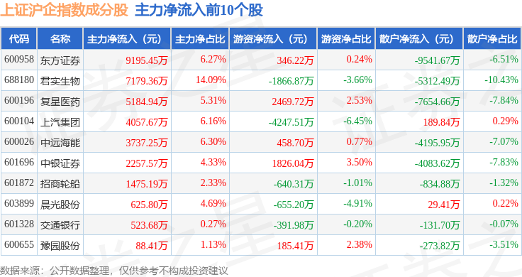 资金流向方面,上证沪企(000062)指数成份股当日主力资金净流出合计21.65亿元,游资资金净流入合计7.41亿元,散户资金净流入合计14.24亿元。成份股资金流向详情见下表: