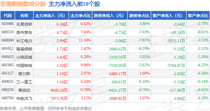 资金流向方面,非周期(000064)指数成份股当日主力资金净流出合计41.94亿元,游资资金净流入合计15.71亿元,散户资金净流入合计26.24亿元。成份股资金流向详情见下表:
