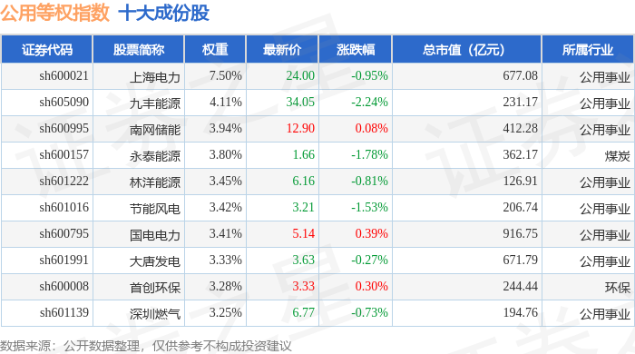 证券之星消息,10月16日,公用等权(000079)指数报收于2621.7点,跌0.14%,成交160.01亿元,换手率0.94%。当日该指数成份股中,上涨的有18家,华能水电以2.15%的涨幅领涨,下跌的有10家,九丰能源以2.24%的跌幅领跌。