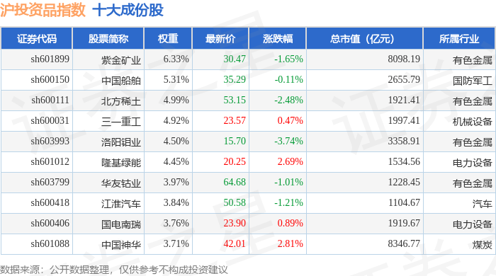 证券之星消息,10月16日,沪投资品(000102)指数报收于7395.71点,跌0.52%,成交926.09亿元,换手率1.67%。当日该指数成份股中,上涨的有19家,中煤能源以7.35%的涨幅领涨,下跌的有30家,恒立液压以4.48%的跌幅领跌。