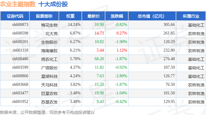 证券之星消息,10月16日,农业主题(000122)指数报收于1607.87点,跌0.85%,成交41.75亿元,换手率1.51%。当日该指数成份股中,上涨的有5家,万向德农以1.85%的涨幅领涨,下跌的有27家,星湖科技以2.8%的跌幅领跌。