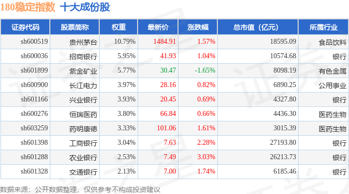证券之星消息,10月16日,180稳定(000125)指数报收于11977.96点,涨0.7%,成交1168.14亿元,换手率0.42%。当日该指数成份股中,上涨的有61家,中煤能源以7.35%的涨幅领涨,下跌的有25家,沪硅产业以4.03%的跌幅领跌。