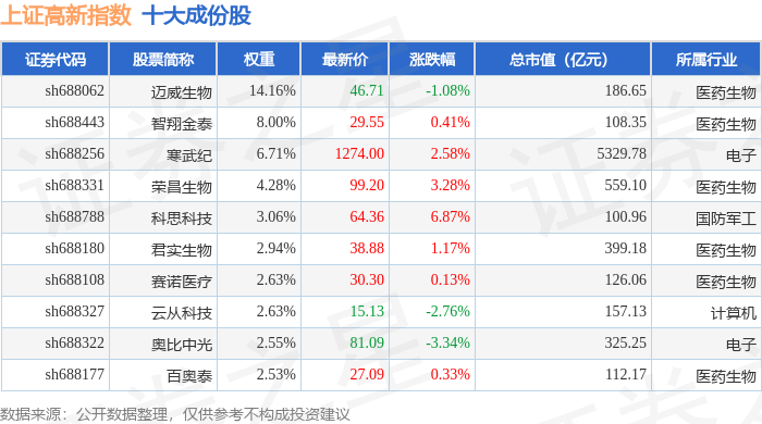 证券之星消息,10月16日,上证高新(000131)指数报收于3752.21点,跌0.45%,成交445.46亿元,换手率1.9%。当日该指数成份股中,上涨的有10家,科思科技以6.87%的涨幅领涨,下跌的有39家,臻镭科技以4.82%的跌幅领跌。