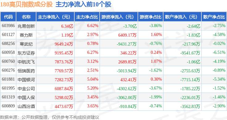 资金流向方面,180高贝(000135)指数成份股当日主力资金净流出合计43.97亿元,游资资金净流入合计20.28亿元,散户资金净流入合计23.69亿元。成份股资金流向详情见下表: