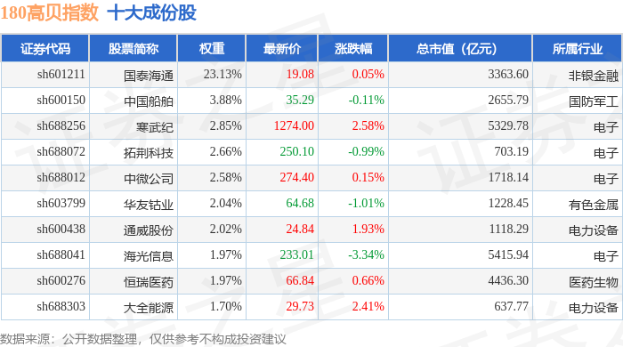 证券之星消息,10月16日,180高贝(000135)指数报收于6188.26点,跌0.02%,成交1356.74亿元,换手率1.01%。当日该指数成份股中,上涨的有28家,中国人寿以5.16%的涨幅领涨,下跌的有29家,恒立液压以4.48%的跌幅领跌。