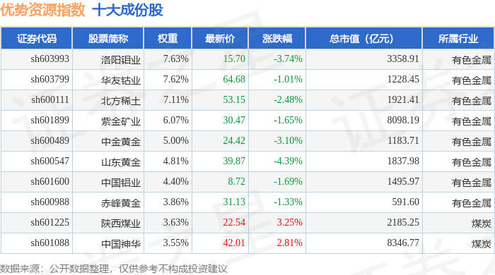 证券之星消息,10月16日,优势资源(000145)指数报收于7677.26点,跌1.15%,成交722.91亿元,换手率1.18%。当日该指数成份股中,上涨的有14家,白银有色以10.0%的涨幅领涨,下跌的有25家,盛和资源以7.43%的跌幅领跌。