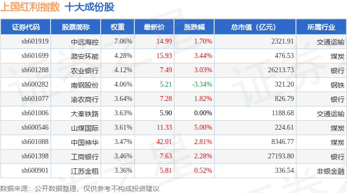 证券之星消息,10月16日,上国红利(000151)指数报收于1586.72点,涨1.4%,成交313.39亿元,换手率0.32%。当日该指数成份股中,上涨的有26家,山煤国际以5.0%的涨幅领涨,下跌的有3家,南钢股份以3.34%的跌幅领跌。