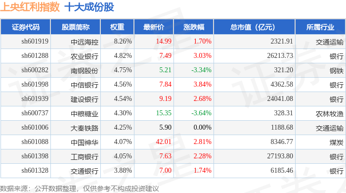 证券之星消息,10月16日,上央红利(000152)指数报收于2864.64点,涨0.71%,成交358.46亿元,换手率0.28%。当日该指数成份股中,上涨的有19家,中煤能源以7.35%的涨幅领涨,下跌的有9家,中粮糖业以3.64%的跌幅领跌。