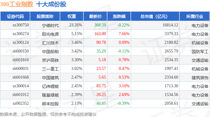 证券之星消息,10月16日,300工业(000910)指数报收于2576.83点,涨0.57%,成交1124.91亿元,换手率0.97%。当日该指数成份股中,上涨的有32家,阳光电源以7.66%的涨幅领涨,下跌的有34家,恒立液压以4.48%的跌幅领跌。