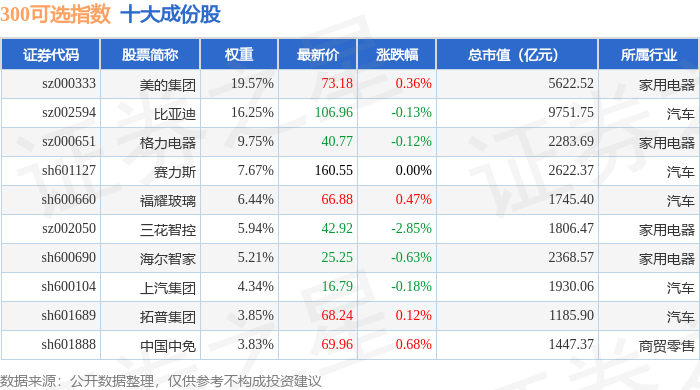 证券之星消息,10月16日,300可选(000911)指数报收于6613.03点,跌0.12%,成交432.92亿元,换手率1.64%。当日该指数成份股中,上涨的有6家,长安汽车以3.82%的涨幅领涨,下跌的有14家,星宇股份以4.31%的跌幅领跌。