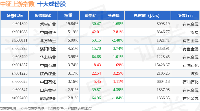 证券之星消息,10月16日,中证上游(000961)指数报收于4580.95点,跌0.91%,成交849.62亿元,换手率0.89%。当日该指数成份股中,上涨的有19家,中煤能源以7.35%的涨幅领涨,下跌的有31家,山东黄金以4.39%的跌幅领跌。