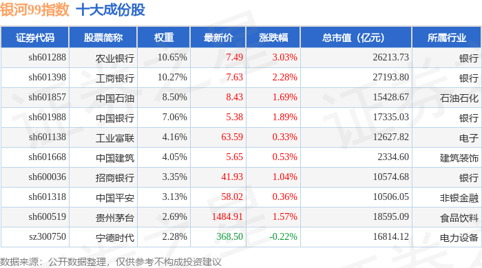 证券之星消息,10月16日,银河99(000959)指数报收于7956.26点,涨1.22%,成交2938.76亿元,换手率0.48%。当日该指数成份股中,上涨的有60家,阳光电源以7.66%的涨幅领涨,下跌的有36家,山东黄金以4.39%的跌幅领跌。