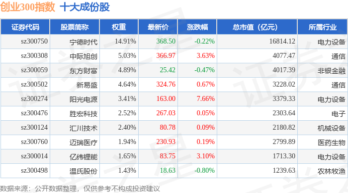 创业300(399012)指数十大成份股详情如下:
