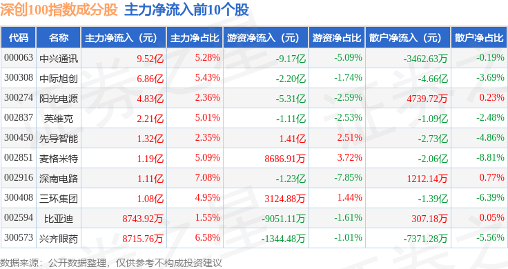 资金流向方面,深创100(399088)指数成份股当日主力资金净流出合计36.98亿元,游资资金净流入合计12.85亿元,散户资金净流入合计24.13亿元。成份股资金流向详情见下表: