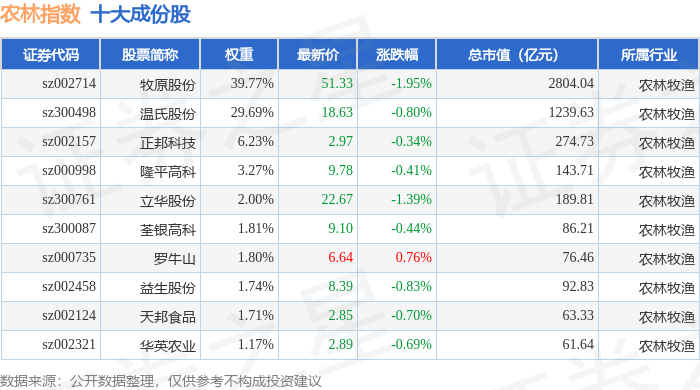 资金流向方面,农林指数(399231)成份股当日主力资金净流出合计3.44亿元,游资资金净流入合计4014.57万元,散户资金净流入合计3.04亿元。成份股资金流向详情见下表: