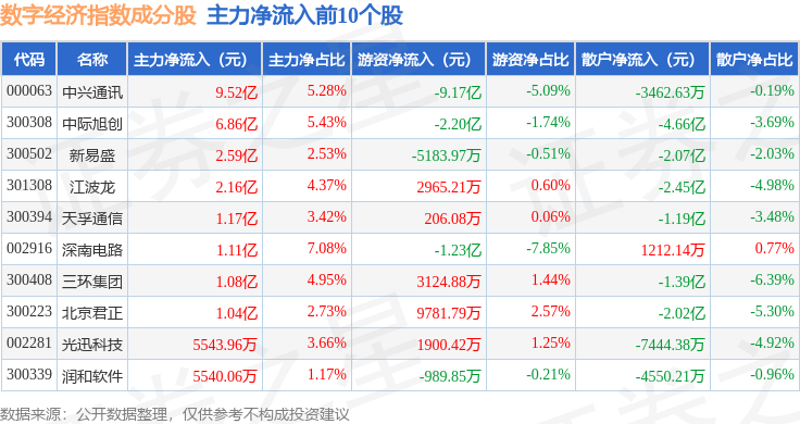 资金流向方面,数字经济(399262)指数成份股当日主力资金净流出合计14.28亿元,游资资金净流入合计2.32亿元,散户资金净流入合计11.96亿元。成份股资金流向详情见下表: