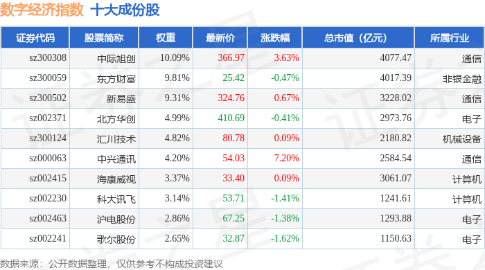 证券之星消息,10月16日,数字经济(399262)指数报收于2696.31点,涨0.38%,成交1369.42亿元,换手率2.58%。当日该指数成份股中,上涨的有18家,中兴通讯以7.2%的涨幅领涨,下跌的有31家,华大九天以4.59%的跌幅领跌。
