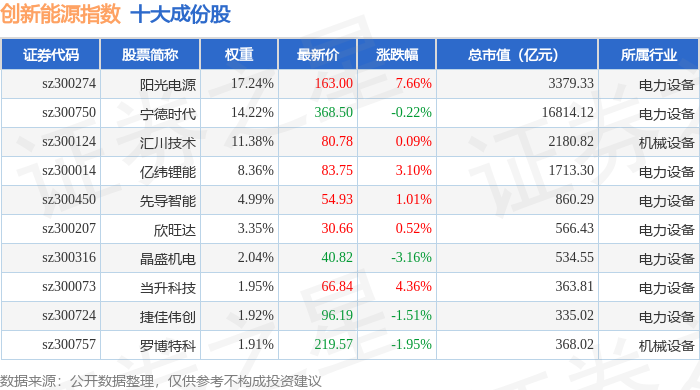 证券之星消息,10月16日,创新能源(399266)指数报收于3571.95点,涨1.02%,成交873.46亿元,换手率4.49%。当日该指数成份股中,上涨的有13家,阳光电源以7.66%的涨幅领涨,下跌的有37家,飞荣达以8.64%的跌幅领跌。