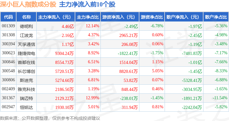 资金流向方面,深小巨人(399268)指数成份股当日主力资金净流出合计13.43亿元,游资资金净流入合计5.81亿元,散户资金净流入合计7.62亿元。成份股资金流向详情见下表: