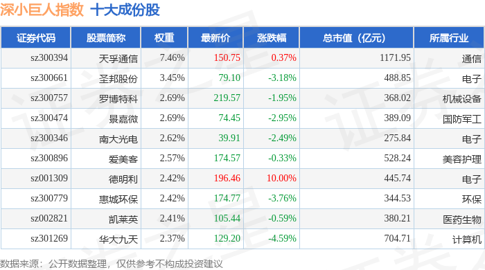 深小巨人(399268)指数十大成份股详情如下: