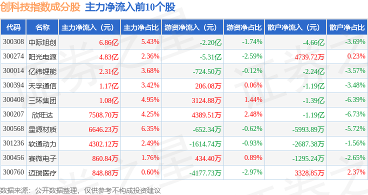 资金流向方面,创科技(399276)指数成份股当日主力资金净流出合计12.36亿元,游资资金净流入合计5.79亿元,散户资金净流入合计6.57亿元。成份股资金流向详情见下表: