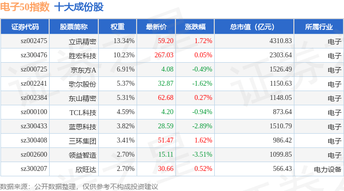证券之星消息,10月16日,电子50(399281)指数报收于4456.78点,跌0.64%,成交759.51亿元,换手率2.16%。当日该指数成份股中,上涨的有12家,立讯精密以1.72%的涨幅领涨,下跌的有38家,飞荣达以8.64%的跌幅领跌。