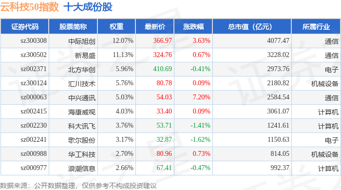 云科技50(399279)指数十大成份股详情如下: