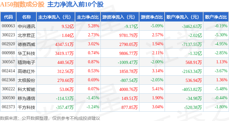 资金流向方面,AI50(399284)指数成份股当日主力资金净流出合计18.1亿元,游资资金净流入合计3.85亿元,散户资金净流入合计14.25亿元。成份股资金流向详情见下表: