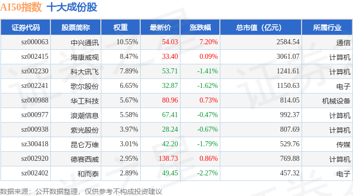 AI50(399284)指数十大成份股详情如下: