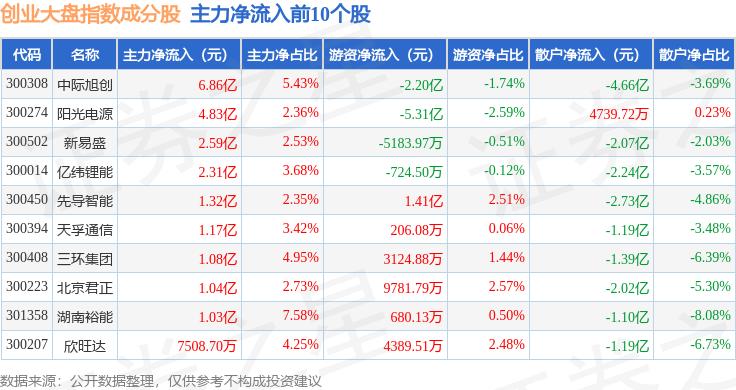 资金流向方面,创业大盘(399293)指数成份股当日主力资金净流出合计17.87亿元,游资资金净流入合计9.81亿元,散户资金净流入合计8.06亿元。成份股资金流向详情见下表: