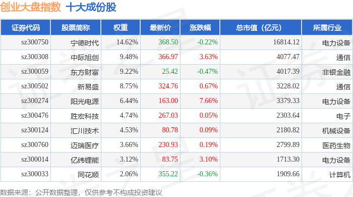 证券之星消息,10月16日,创业大盘(399293)指数报收于6074.53点,涨0.69%,成交1341.5亿元,换手率2.25%。当日该指数成份股中,上涨的有18家,阳光电源以7.66%的涨幅领涨,下跌的有32家,华大九天以4.59%的跌幅领跌。
